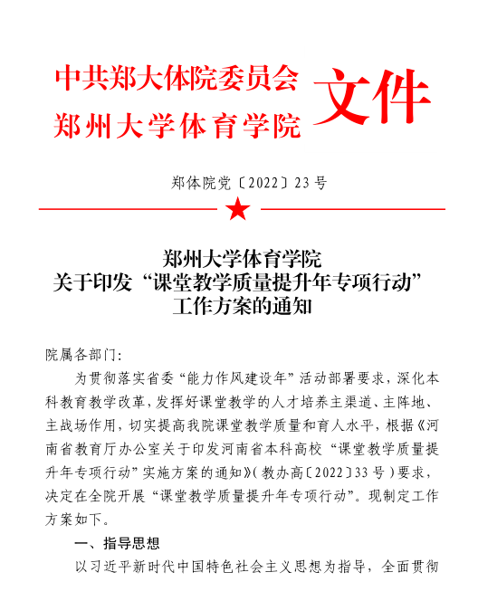 . . .详情郑州大学体育学院关于印发“课堂教学质量提升年专项行动”工作方案的通知